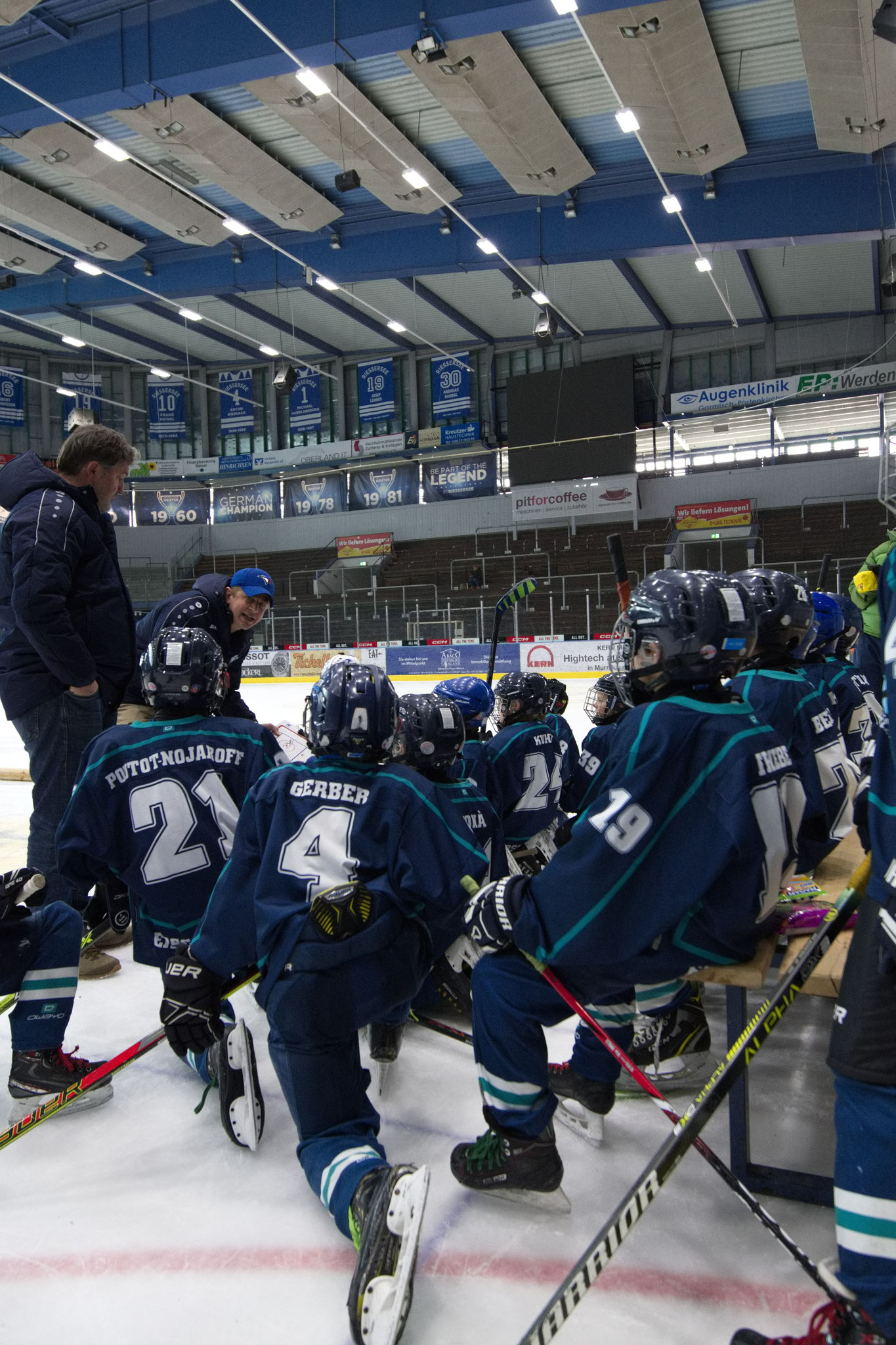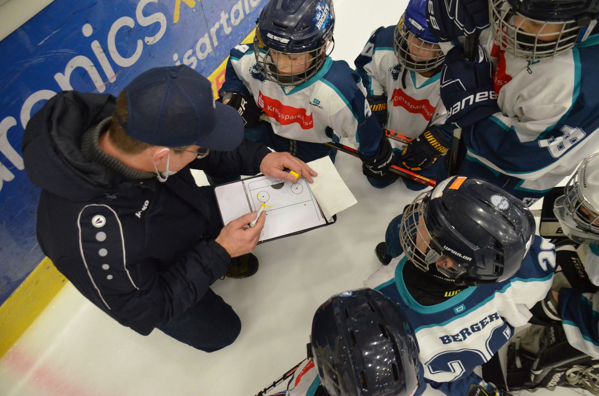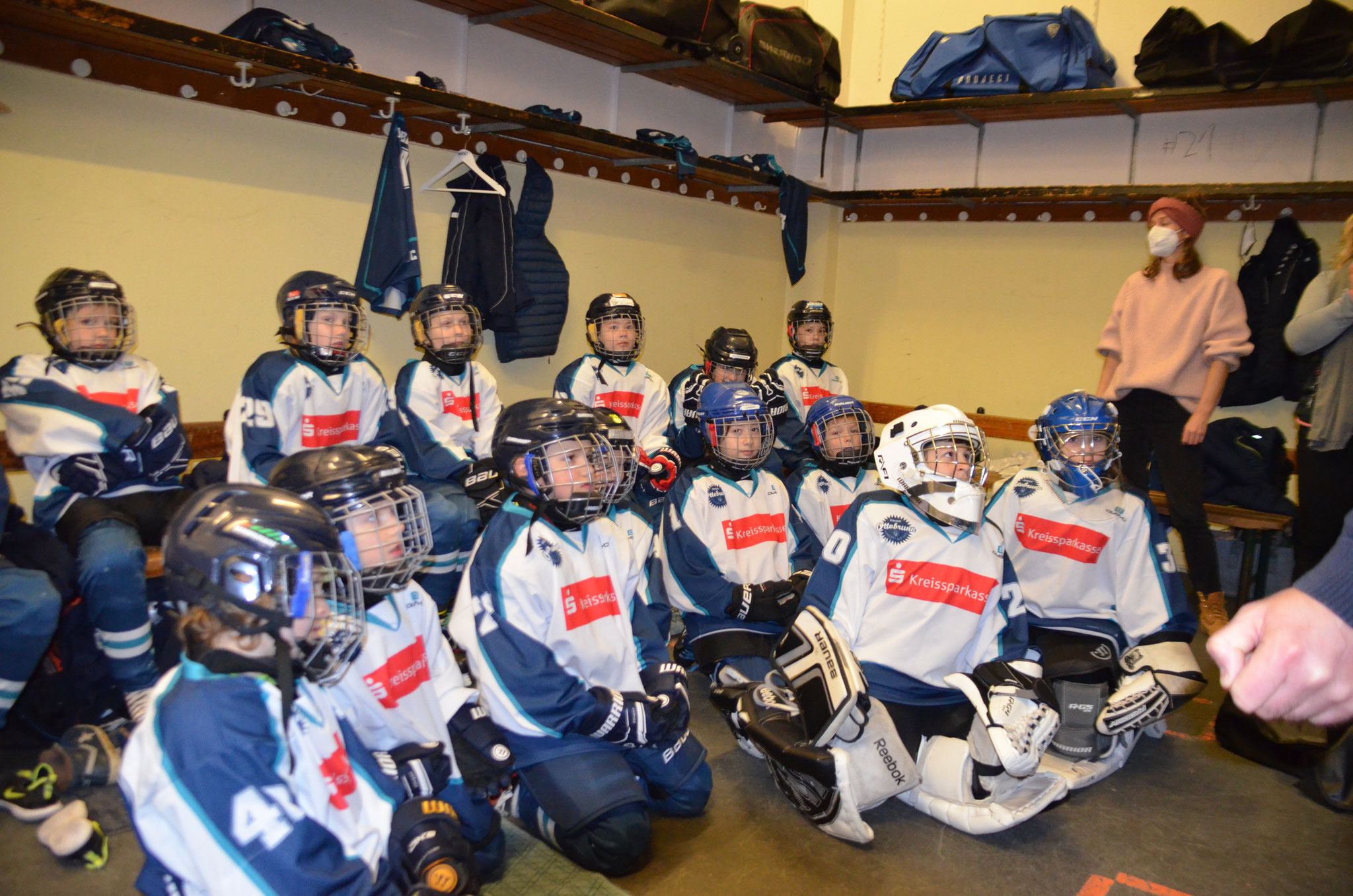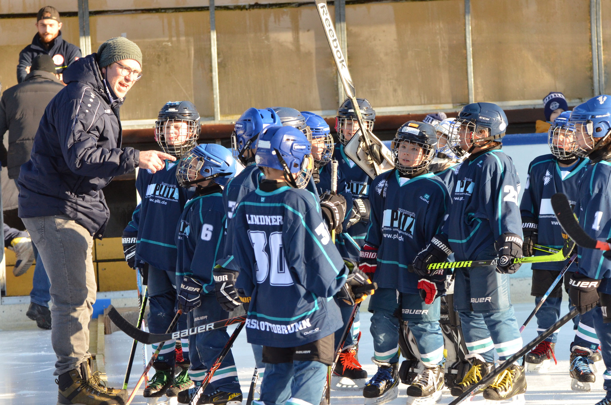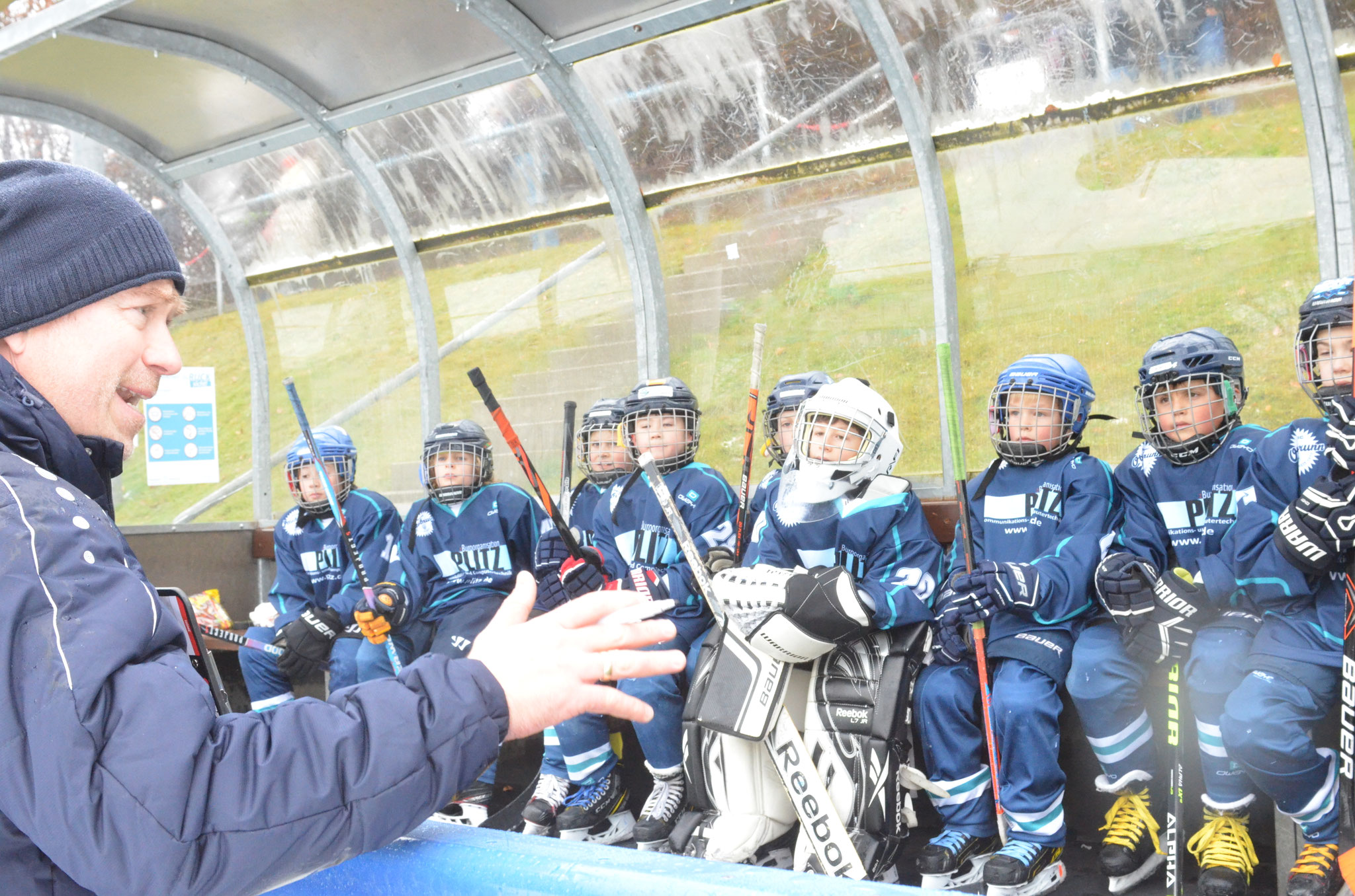 Letzter Preptalk in der Pause, in dem der Trainer die Kinder lobt, ihnen aber noch mal drei Dinge für das letzte Drittel mitgibt: Respekt, Kommunikation auf dem Eis und mehr Schlittschuh fahren! Das lassen die Kids sich nicht zweimal sagen, und so beenden Sie das letzte Drittel mit einem Torfeuerwerk und einer weiteren 0:9 Glanzleistung.