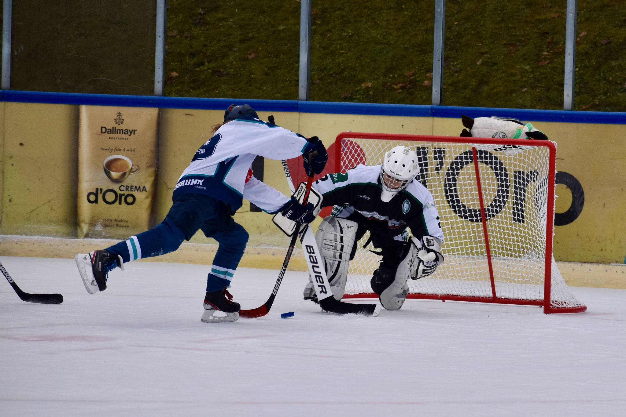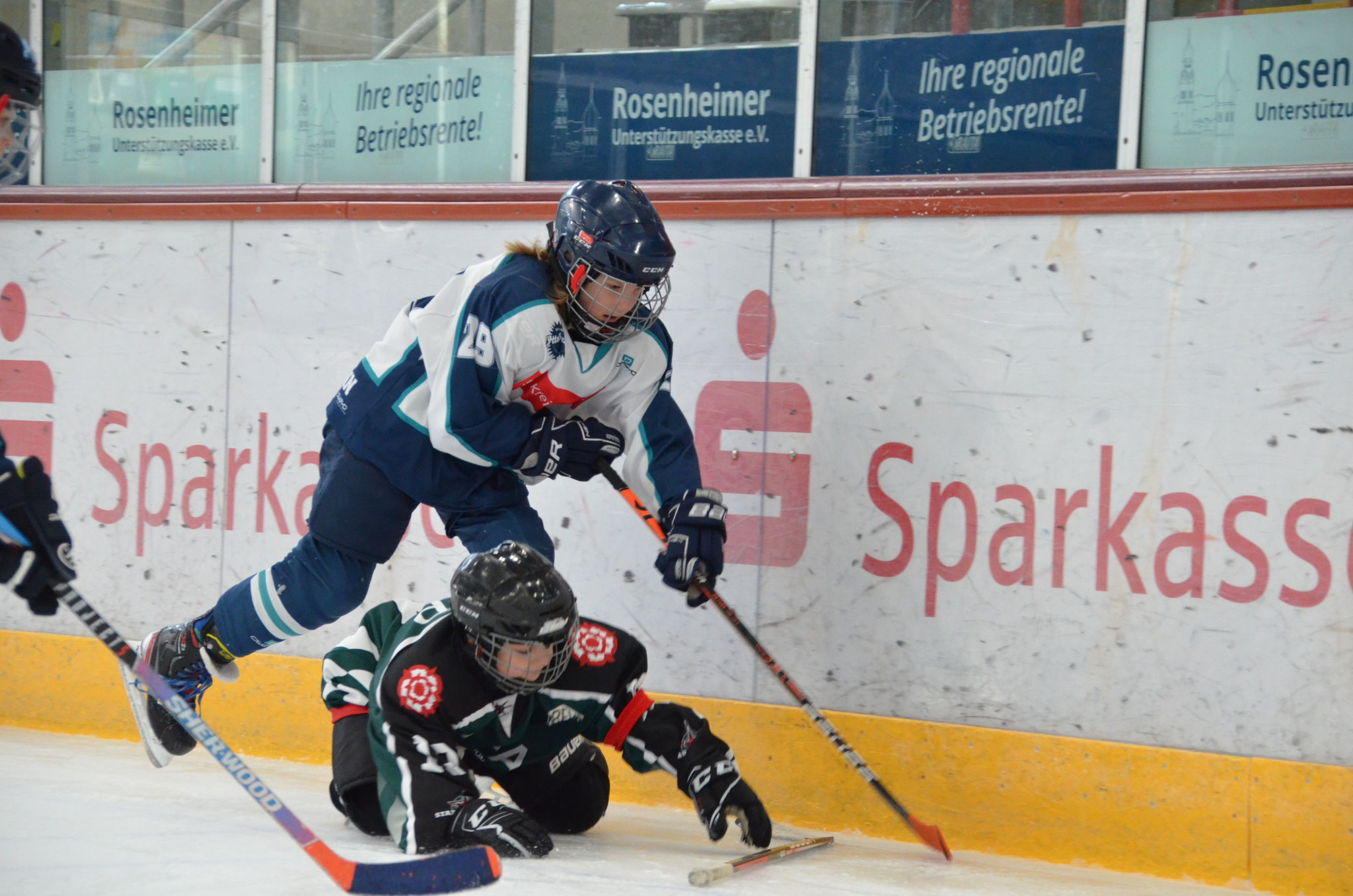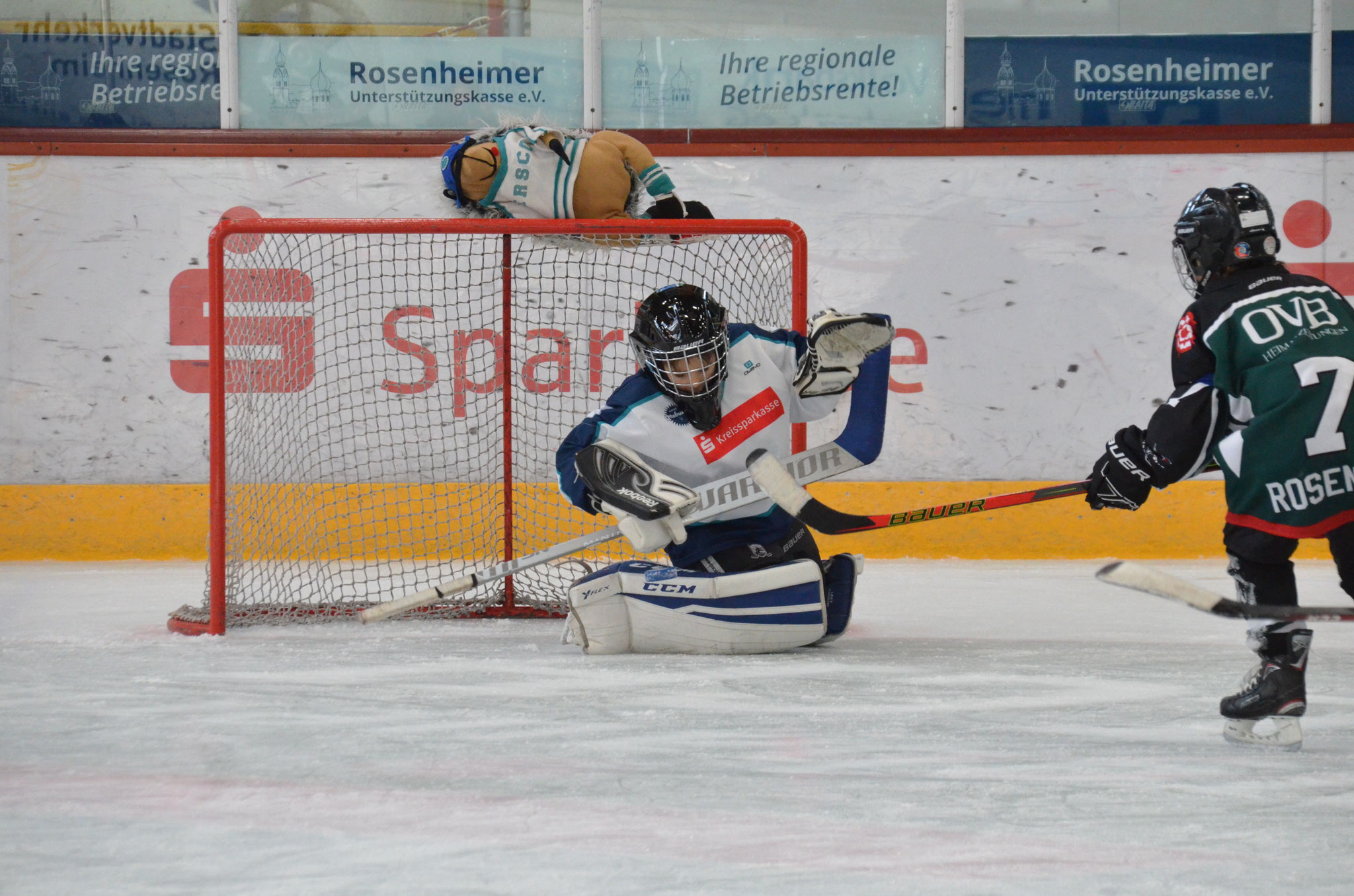 Der Rosenheimer Goalie, war heute das erste Mal im Tor und hielt den Schüssen stand. Doch bissig wurde jeder Abpraller über die Linie gedrückt oder im vollen Lauf ins Kreuzeck gezimmert. So ging es weiter und das erfolgsverwöhnte Publikum klatschte Beifall. Das 1. Drittel wurde 13:0 gewonnen.