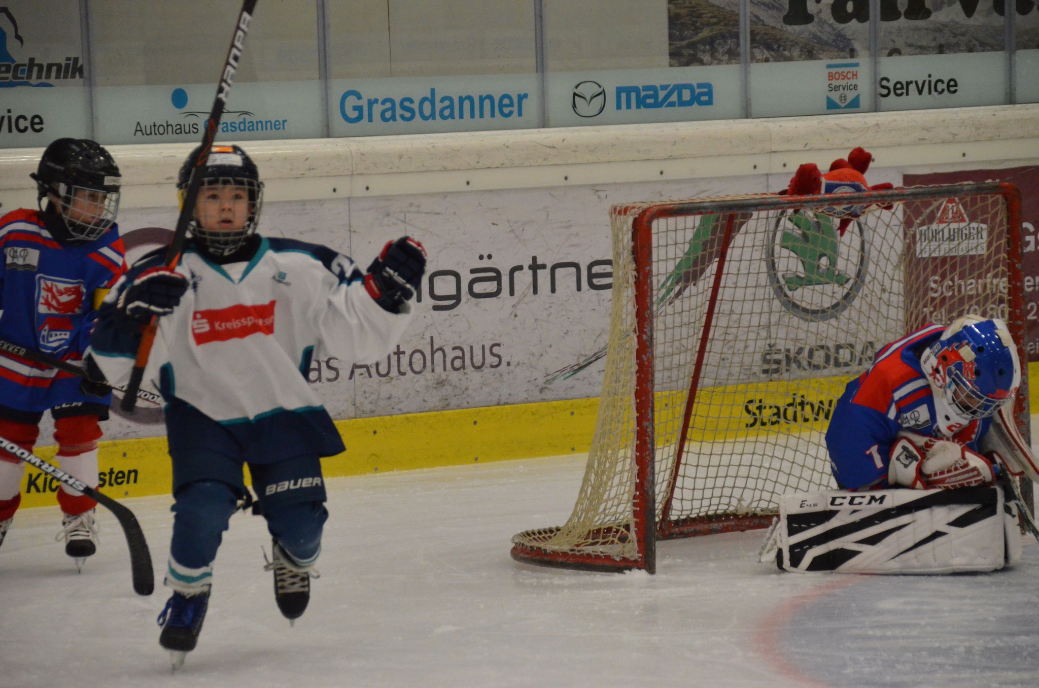 Wie sehr die Kinder über die Sommermonate in Miesbach, Bad Tölz und Mittenwald zusammengewachsen sind, wurde heute nicht nur vor der Halle sichtbar, sondern ganz besonders auch auf dem Eis. Das Trainer- und Betreuerteam hat es geschafft, aus einem Haufen wilder Kids mit tierisch Lust aufs Eis, eine Einheit zu bilden. Die Worte des Trainers Patrick in der Kabine vor Beginn des Spiels, nämlich dem Herausheben des respektvollen Umgangs miteinander, in den Ohren, stürmen unsere Jungs los. Und zwar gemeinsam als Team. Sie zeigen von Beginn an eine sehr starke Leistung, suchen einander, spielen saubere und kluge Pässe und zeigen großartige Schüsse aufs Tor. So eine Performance und so ein Zusammenhalt bleiben natürlich nicht ohne Wirkung – und so gewinnen sie das erste Drittel mit 1:9.