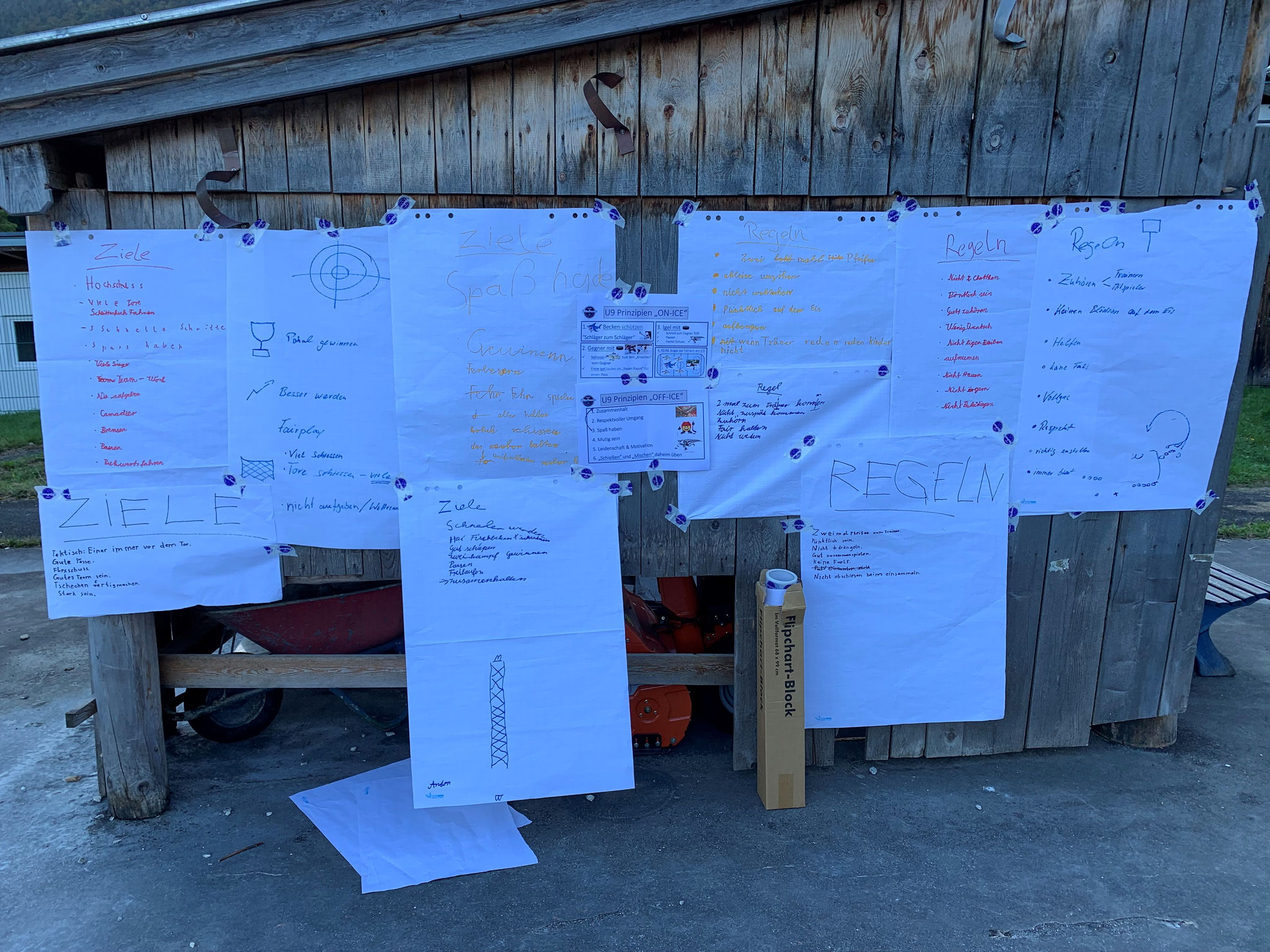 Mehr oder weniger ausgeruht ging es am Samstag bereits um 8 Uhr los ins Stadion. Dort angekommen packte Trainer Patrick allerdings statt den Schlittschuhen seinen Flipchart-Block und die Edding-Stifte aus. Die U9er wurden in Gruppen eingeteilt und sie durften eigenständig ihre Gedanken und Ideen zum Thema „Ziele“ und „Regeln“ schriftlich festhalten und auch vor allen selbst vortragen. „FERness“ und „FERbessern“ war der Mannschaft dabei besonders wichtig 😊