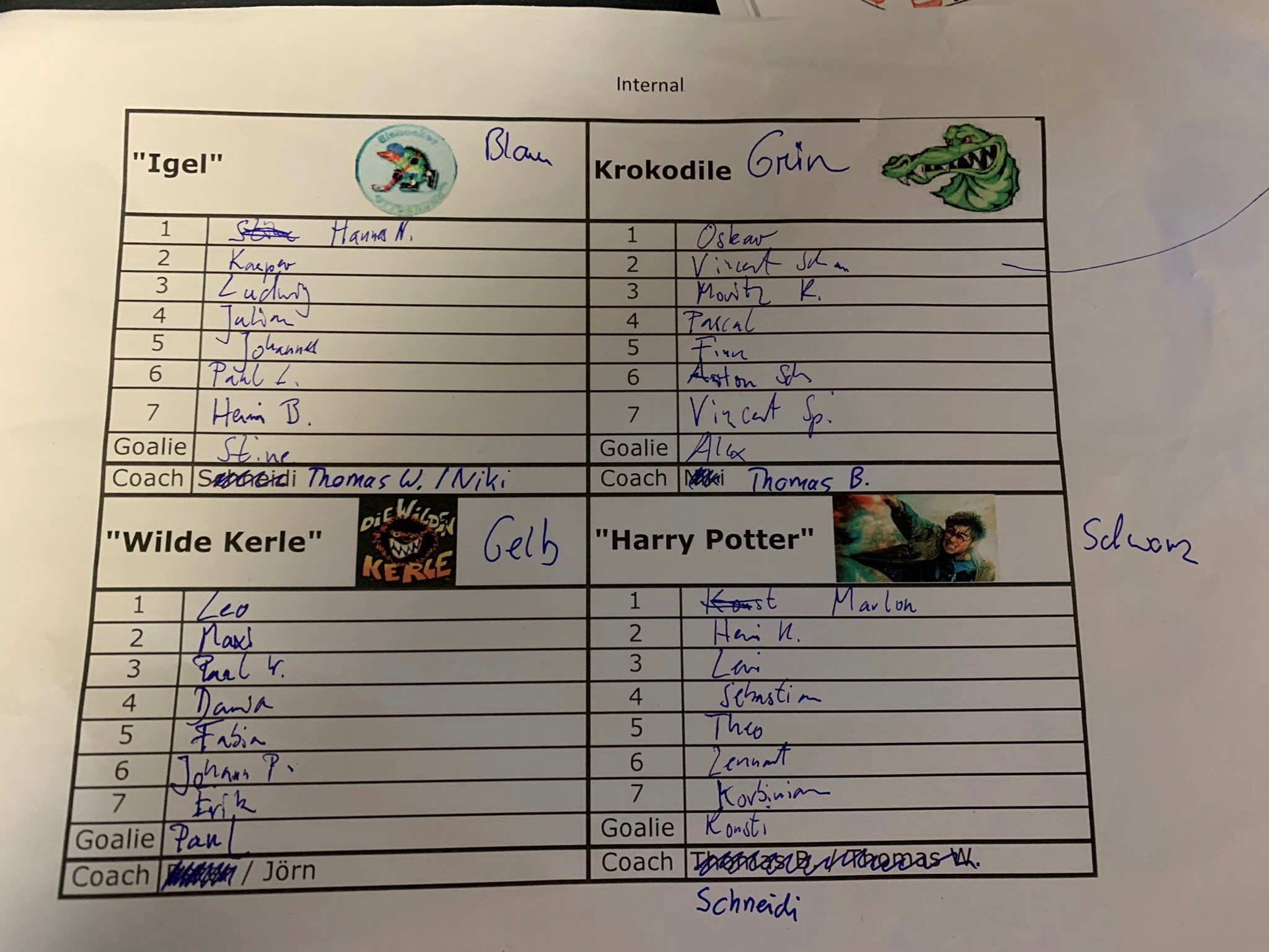 Der Sonntag brachte schon am Morgen große Spannung mit sich. Nach dem gemeinsamen Aufwärmen wurden Mannschaften verlost. Stine und die Jungs teilten sich auf in die Teams „Igels“ in blau, die „Krokodile“ in grün, die „wilden Kerle“ in gelb und das Team „Harry Potter“ in schwarz. Jedes Team wählte einen Kapitän und übte einen „Schlachtruf“ ein, der bereits vor Spielbeginn die Gegner erzittern lassen soll. Die Kapitäne hielten mit ihrer Mannschaft eine Sitzung ab und besprachen Positionen, Taktik und die Stärken und Schwächen der Gegner.